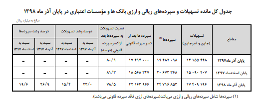 آمارهای بانک مرکزی از افزایش ۲۶.۹ درصدی مانده سپرده‌ها و ۲۳ درصدی مانده تسهیلات بانکی در پایان آذر ۹۸ نسبت به مقطع مشابه سال قبل حکایت دارد.