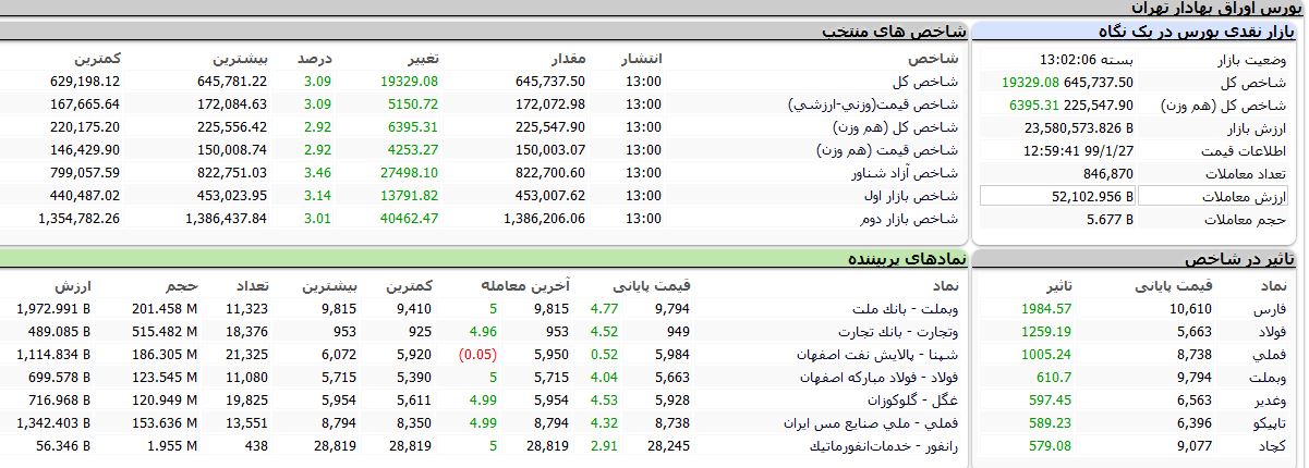 بر اساس آمارهای معاملاتی، روز جاری اکثر شاخصهای بورس با رشد مواجه شدند به طوری که شاخص کل با ۱۹۳۴۲ واحد رشد معادل ۳.۰۹ درصد به ۶۴۵ هزار و ۷۸۱ واحد، شاخص قیمت «وزنی - ارزشی» با ۵۱۵۶ واحد افزایش معادل ۳.۰۹ درصد به ۱۷۲ هزار و ۷۸ واحد، شاخص کل «هم وزن» با ۶۴۰۴ واحد رشد معادل ۲.۰۹۹ درصد به ۲۲۵ هزار و ۵۵۶ واحد، شاخص قیمت «هم وزن» با ۴۲۵۹ واحد افزایش، معادل ۲.۹۲ درصد به ۱۵۰ هزار و ۹ واحد، شاخص آزاد شناور با ۲۷۵۱۷ واحد کاهش، معادل ۳.۴۶ درصد به ۸۲۲ هزار و ۷۲۰ واحد، شاخص بازار اول با ۱۳۷۹۱ واحد افزایش معادل ۳.۱۴ درصد به ۴۵۳ هزار ۷ واحد و شاخص بازار دوم با ۴۰۵۶۸ واحد رشد معادل ۳.۰۱ درصد، به یک هزار و ۳۸۶ واحد رسید.