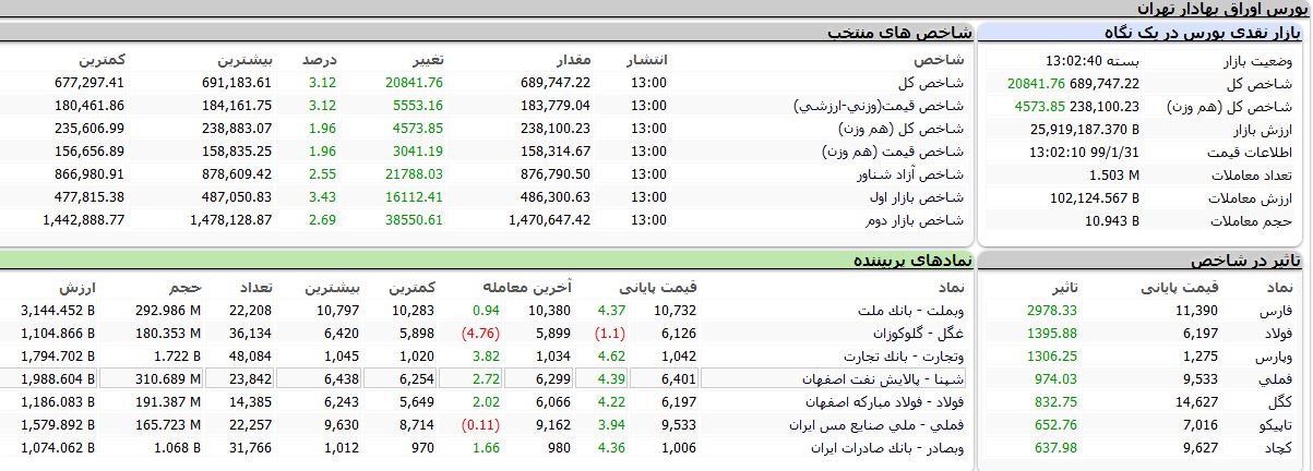 بر اساس آمارهای معاملاتی، روز جاری اکثر شاخصهای بورس با رشد مواجه شدند به طوری که شاخص کل با ۲۰۸۴۰ واحد رشد معادل ۳.۱۲ درصد به ۶۸۹ هزار و ۷۴۴ واحد، شاخص قیمت «وزنی - ارزشی» با ۵۵۵۲ واحد افزایش معادل ۳.۱۲ درصد به ۲۳۸ هزار و ۹۸ واحد، شاخص کل «هم وزن» با ۴۵۷۲ واحد افزایش معادل۱.۹۶ درصد به ۱۵۸ هزار و ۳۱۳ واحد، شاخص قیمت «هم وزن» با ۳۰۴۰ واحد افزایش معادل ۱.۹۶ درصد به ۱۵۵ هزار و ۲۹۴ واحد، شاخص آزاد شناور با ۲۱۸۷۸ واحد افزایش معادل ۲.۵۵ درصد به ۸۷۶ هزار و ۷۸۸ واحد، شاخص بازار اول با ۱۶۱۱۲ واحد افزایش معادل ۳.۴۳ درصد به ۴۸۶ هزار ۳۰۰ واحد و شاخص بازار دوم با ۳۸۵۴۳ واحد رشد معادل ۲.۶۹ درصد، به یک هزار و ۴۷۰ واحد رسید.