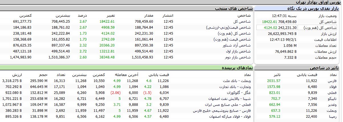 بر اساس آمارهای معاملاتی، روز جاری اکثر شاخصهای بورس با رشد مواجه شدند به طوری که شاخص کل با ۱۸۴۴۶ واحد رشد معادل ۲.۶۷ درصد به ۷۰۸ هزار و ۴۸۲ واحد، شاخص قیمت «وزنی - ارزشی» با ۴۹۱۴ واحد افزایش معادل ۲.۶۷ درصد به ۱۸۸ هزار و ۷۷۱ واحد، شاخص کل «هم وزن» با ۴۱۳۷ واحد افزایش معادل ۱.۷۴ درصد به ۲۴۲ هزار و ۲۴۴ واحد، شاخص قیمت «هم وزن» با ۲۷۵۰ واحد افزایش معادل ۱.۷۴ درصد به ۱۶۱ هزار و ۷۰ واحد، شاخص آزاد شناور با ۲۰۳۸۷ واحد افزایش معادل ۲.۳۲ درصد به ۸۹۷ هزار و ۳۷۱ واحد، شاخص بازار اول با ۱۳۲۱۲ واحد افزایش معادل ۲.۷۲ درصد به ۴۹۹ هزار ۵۱۴ واحد و شاخص بازار دوم با ۳۸۴۶۶ واحد رشد معادل ۲.۶۱ درصد، به یک هزار و ۵۱۰ واحد رسید.