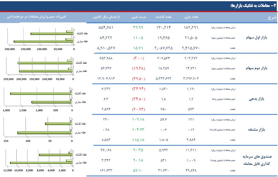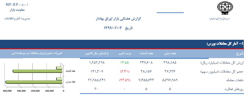 از سویی دیگر، در هفته اول دومین ماه بهار، ارزش کل معاملات اوراق بهادار به ۳۹۸.۱۸۵ میلیارد ریال بالغ شد که نسبت به هفته قبل ۱۴.۵۵ درصد افزایش یافت. در ضمن تعداد ۳۷.۲۳۶ میلیون انواع اوراق بهادار در بیش از ۵ میلیون و ۶۹۶ هزار دفعه مورد معامله قرار گرفت و به ترتیب ۲.۴۱ درصد و ۲۳.۵۹ درصد کاهش را نسبت به هفته گذشته تجربه کردند.