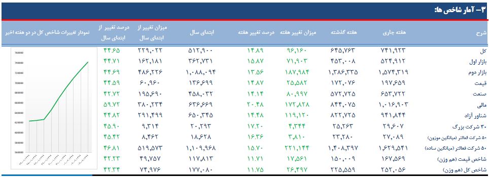 به گزارش ایبِنا، اطلاعات منتشر شده از سوی بورس اوراق بهادار تهران در پایان معاملات هفته منتهی به ۳ اردیبهشت ماه ۹۹، شاخص کل با ۱۴.۸۹ درصد افزایش به ۷۴۱.۹۲۳ واحد رسید. بر اساس این گزارش، شاخص کل هم وزن با ۲۶.۴۹۷ واحد افزایش معادل ۱۱.۷۵ درصد به ۲۵۲.۰۵۶ واحد دست پیدا کرد.