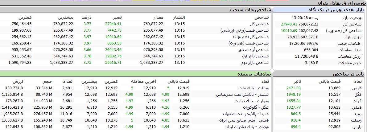 بر اساس آمارهای معاملاتی، روز جاری اکثر شاخص‌های بورس با رشد مواجه شدند به طوری که شاخص کل با ۲۷۹۴۰ واحد رشد معادل ۳.۷۷ درصد به ۷۶۹ هزار و ۸۷۲ واحد، شاخص‌ قیمت «وزنی - ارزشی» با ۷۴۴۲ واحد افزایش معادل ۳.۷۷ درصد به ۲۰۵ هزار و ۷۷ واحد، شاخص کل «هم وزن» با ۱۰۰۱۰ واحد افزایش معادل ۳.۹۷ درصد به ۲۶۲ هزار و ۶۷ واحد، شاخص قیمت «هم وزن» با ۶۶۵۳ واحد افزایش معادل ۳.۷۹ درصد به ۱۷۴ هزار و ۱۸۰ واحد، شاخص آزاد شناور با ۳۴۴۴۳ واحد افزایش معادل ۳.۶۶ درصد به ۹۷۶ هزار و ۲۹۳ واحد، شاخص بازار اول با ۱۹۸۳۲ واحد افزایش معادل ۳.۷۸ درصد به ۵۴۴ هزار ۷۴۴ واحد و شاخص بازار دوم با ۵۹۰۱۶ واحد رشد معادل ۳.۷۵ درصد، به یک هزار و ۶۳۳ واحد رسید.
