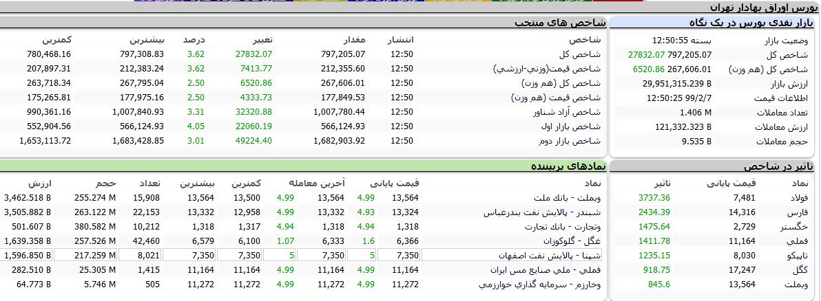 بر اساس آمارهای معاملاتی، روز جاری اکثر شاخصهای بورس با رشد مواجه شدند به طوری که شاخص کل با ۲۷۸۳۵ واحد رشد معادل ۳.۶۲ درصد به ۷۹۷ هزار و ۲۱۰ واحد، شاخص قیمت «وزنی - ارزشی» با ۷۴۱۴ واحد افزایش معادل ۳.۶۲ درصد به ۲۱۲ هزار و ۵۳۶ واحد، شاخص کل «هم وزن» با ۶۵۲۳ واحد افزایش معادل ۲.۵۰ درصد به ۲۶۷ هزار و ۶۰۹ واحد، شاخص قیمت «هم وزن» با ۴۳۳۵ واحد افزایش معادل ۲.۵۰ درصد به ۱۷۷ هزار و ۸۵۱ واحد، شاخص آزاد شناور با ۳۲۳۲۵ واحد افزایش معادل ۳.۳۱ درصد به یک هزار و ۷ واحد، شاخص بازار اول با ۲۲۰۶۰ واحد افزایش معادل ۴.۰۵ درصد به ۵۶۶ هزار ۱۲۴ واحد و شاخص بازار دوم با ۴۹۲۴۲ واحد رشد معادل ۳.۰۱ درصد، به یک هزار و ۶۸۲ واحد رسید.
