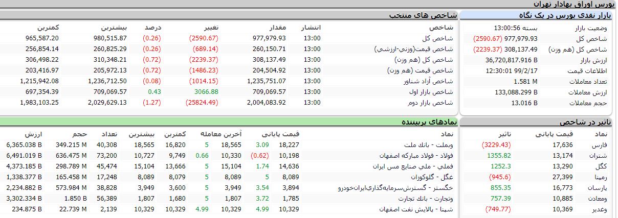 بر اساس آمارهای معاملاتی، روز جاری اکثر شاخص های بورس با ریزش دسته جمعی مواجه شدند به طوری که شاخص کل با (۲۵۹۰) واحد ریزش معادل (۰.۲۶) درصد به ۹۷۷ هزار ۹۷۹ واحد، شاخص قیمت «وزنی - ارزشی» با (۶۸۹) واحد افت معادل (۰.۲۶) درصد به ۲۶۰ هزار ۱۵۰ واحد، شاخص کل «هم وزن» با (۲۲۳۹) واحد کاهش معادل (۰.۷۲) درصد به ۳۰۸ هزار و ۱۳۷ واحد، شاخص قیمت «هم وزن» با (۱۴۸۶) واحد رشد معادل (۰.۷۲) درصد به ۲۰۴ هزار و ۵۰۴ واحد، شاخص آزاد شناور با (۱۰۱۴) واحد ریزش، معادل (۰.۰۸) درصد به یک میلیون و ۲۳۵ هزار واحد، شاخص بازار اول با ۳۰۶۶ واحد رشد معادل ۰.۴۳ درصد به ۷۰۹ هزار ۶۹ واحد و شاخص بازار دوم با (۲۵۸۲۴) واحد ریزش معادل (۱.۲۷) درصد به ۲ میلیون و ۴ هزار واحد رسید.