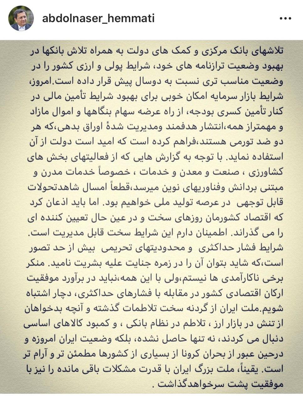به گزارش ایبِنا ، عبدالناصر همتی در پستی اینستاگرامی نوشت، تلاشهای بانک مرکزی و کمک های دولت به همراه تلاش بانکها در بهبود وضعیت ترازنامه های خود، شرایط پولی و ارزی کشور را در وضعیت مناسب تری نسبت به دوسال پیش قرار داده است.