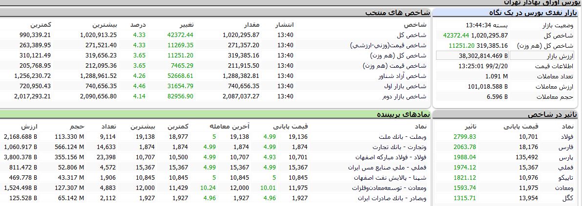 بر اساس آمارهای معاملاتی، روز جاری اکثر شاخصهای بورس با رشد مواجه شدند به طوری که شاخص کل با ۴۲۳۷۲ واحد رشد معادل ۴.۳۳ درصد به یک میلیون و ۲۰ هزار واحد، شاخص قیمت «وزنی - ارزشی» با ۱۱۲۶۹ واحد افزایش معادل ۴.۳۳ درصد به ۲۷۱ هزار و ۳۵۷ واحد، شاخص کل «هم وزن» با ۱۱۲۵۱ واحد افزایش معادل ۳.۶۵ درصد به ۳۱۹ هزار و ۹۱۵ واحد، شاخص قیمت «هم وزن» با ۷۴۶۵ واحد افزایش معادل ۳.۶۵ درصد به ۲۱۱ هزار و ۹۱۵ واحد، شاخص آزاد شناور با ۵۲۶۶۸ واحد افزایش معادل ۴.۲۶ درصد به یک هزار و ۲۸۸ واحد، شاخص بازار اول با ۳۱۶۵۴ واحد افزایش معادل ۴.۴۶ درصد به ۷۴۰ هزار ۶۵۶ واحد و شاخص بازار دوم با ۸۲۹۵۶ واحد رشد معادل ۴.۱۴ درصد، به ۲ هزار و ۸۷ واحد رسید.