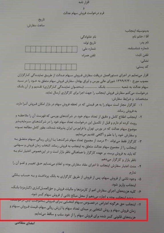 گفتنی است در بند ۷ آمده است، اینجانب حق هرگونه اعتراض در مورد سهام انتخابی برای فروش به موجب این درخواست، زمان فروش و روش انتخابی بر مبنای تعداد سهم یا ارزش ریالی سهام، قیمت فروش سهام و هزینه قانونی کسر شده برای فروش سهام را از خود سلب و ساقط میکنم.