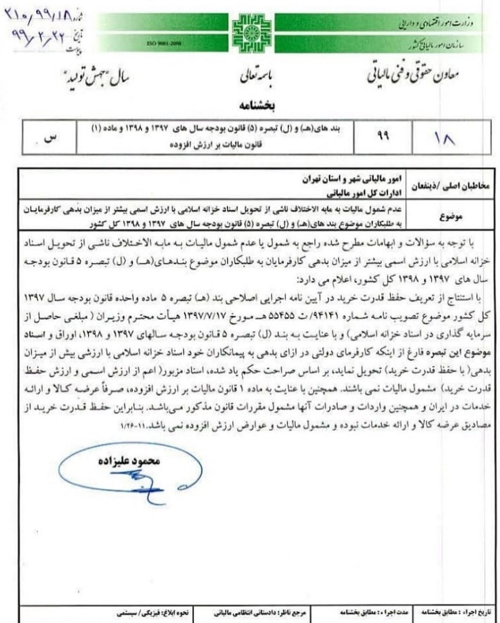 در این نامه به ادارات مالیاتی آمده است: به طلبکاران موضوع بند های (ه) و (ل) تبصره (۵) قانون بودجه سال های ۱۳۹۷ و ۱۳۹۸ کل کشور با توجه به سوالات و ابهامات مطرح شده راجع به شمول یا عدم شمول مالیات به مابه الاختلاف ناشی از تحویل اسناد خزانه اسلامی با ارزش اسمی بیشتر از میزان بدهی کارفرمایان به طلبکاران موضوع بندهای (ه) و (ل) تبصره ۵ قانون بودجه سال های ۱۳۹۷ و ۱۳۹۸ کل کشور، اعلام می دارد: