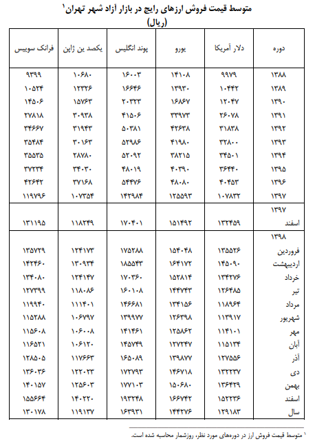 در سال ٩٨ متوسط قیمت فروش یک دلار آمریکا و یک یورو در بازار آزاد شهر تهران به ترتیب ۱۲ هزار و ۹۱۸ تومان و ۱۴ هزار و ۴۲۷ تومان بوده که نسبت به سال ۱۳۹۷ دلار آمریکا ۱۹.۸ درصد و یورو ۱۴.۹ درصد افزایش داشته است. متوسط قیمت فروش سایر ارزهای عمده در جداول زیر نشان داده شده است.