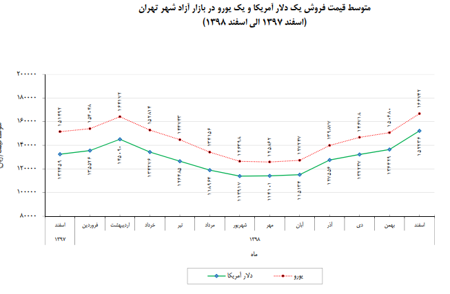 همچنین در اسفندماه ١٣٩٨ متوسط قیمت فروش یک یورو در بازار آزاد شهر تهران ۱۶ هزار و ۶۷۴ تومان بود که در مقایسه با ماه قبل و ماه مشابه سال قبل به ترتیب ۱۰.۷ درصد و ۱۰.۱ درصد افزایش داشته است. همچنین حداقل و حداکثر نرخ فروش یک یورو در ماه مذکور به ترتیب ۱۵ هزار و ۵۲۳ تومان و ١۷ هزار و ۶۴۶ تومان بوده است.