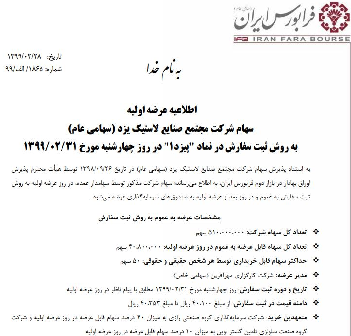 به گزارش خبرنگار ایبِنا در این اطلاعیه آمده است: به استناد پذیرش سهام شرکت مجتمع صنایع لاستیک یزد (سهامی عام) در تاریخ ۲۶ آذر ۹۸ توسط هیأت پذیرش اوراق بهادار در بازار دوم فرابورس ، سهام شرکت مذکور توسط سهامدار عمده در روز عرضه اولیه به روش ثبت سفارش به عموم مردم و در دو روز بعد از عرضه اولیه به صندوق‌های سرمایه‌گذاری عرضه می‌شود.