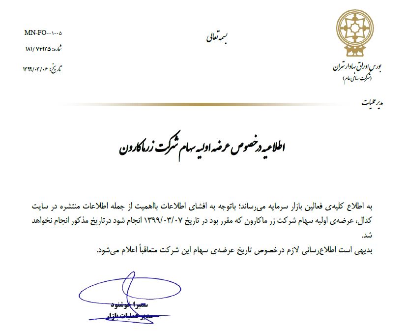 بورس اوراق بهادار تهران با صدور اطلاعیه ای اعلام کرد : عرضه اولیه سهام زرماکارون تا اطلاع ثانوی لغو شد.