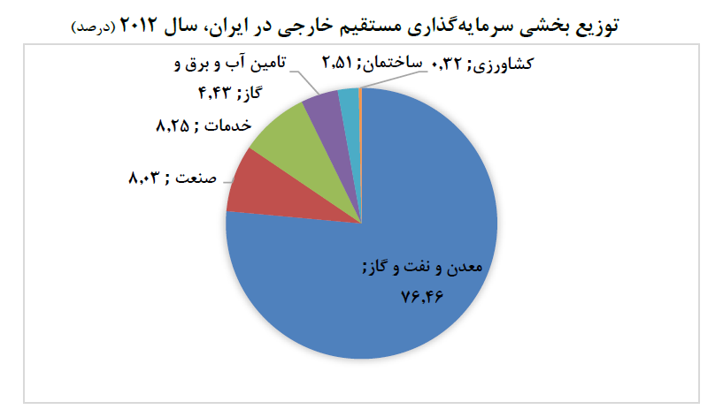 جذب سرمایه خارجی در ایران منبعمحور بوده و به ندرت وارد تولید شده است. به لحاظ توزیع بخشی، عمده سرمایه خارجی در منابع اولیه و درحقیقت بخش نفت خام وارد شده و به لحاظ روش سرمایهگذاری غالباً به شکل ترتیبات قراردادی (شامل بیع متقابل، BOT و...) است. طبق گزارش سازمان سرمایهگذاری اقتصادی و فنی (علیشیری و شمس، ۱۳۹۲)، در سال ۲۰۱۲ بخش معدن (شامل معدن، بالادست نفت و گاز و صنایع معدنی و صنایع مرتبط) همانند سالهای گذشته بخش پیشرو در جذب سرمایهگذاریهای خارجی بوده و سهم ۷۶ درصدی خود را حفظ کرده و قریب به ۳.۵ میلیارد دلار سرمایه خارجی جذب کرده است . بخش خدمات برای نخستین بار با جذب ۳۸۲ میلیون دلار در سال ۲۰۱۲ از بخش صنعت پیشی گرفته است. نمودار زیر میزان و درصد سهم هریک از بخشهای اقتصادی کشور را از سرمایهگذاری خارجی جذب شده در سال ۲۰۱۲ نشان میدهد.