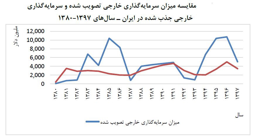 نمودار زیر تفاوت میان سرمایهگذاری خارجی تصویب شده و میزان واقعی سرمایهگذاری خارجی جذب شده از سال ۱۳۸۰ تا ۱۳۹۷ را در کشور نشان میدهد. همانگونه که در نمودار ملاحظه میشود در فاصله سالهای ۱۳۸۳ تا ۱۳۸۶ و نیز سالهای ۱۳۹۴ تا ۱۳۹۷ میزان سرمایهگذاری خارجی مصوب بسیار بیشتر از جذب واقعی و در برخی از سالها چندین برابر بوده است. در حقیقت سرمایهگذار خارجی مجوز سرمایهگذاری را اخذ کرده و از مزیت دریافت اطلاعات در مرحله مذاکره بهرهمند شده، اما سرمایه خود را به داخل کشور نیاورده و پروژه را آغاز نکرده است. نکته بسیار مهم که باید به آن توجه نمود اینکه تکیه بر آمار سرمایهگذاری خارجی مصوب به جای عملکرد، برای ارزیابی وضعیت جذب FDI در ایران به شدت گمراهکننده است.