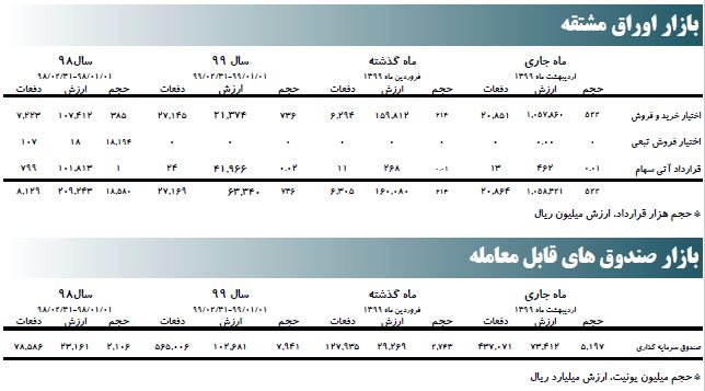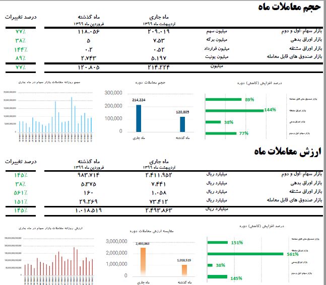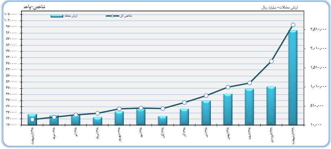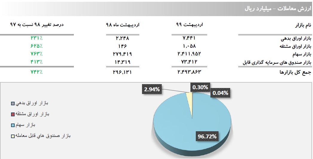 بر اساس این گزارش طی ۲۳ روز کاری اردیبهشت ماه ۹۹، ارزش معاملات در مقایسه با پایان فروردین ۹۸، معادل ۱۴۵ درصد افزایش یافت و از ۱.۰۱۸.۵۱۹ میلیارد ریال به ۲.۴۹۳.۸۶۳ میلیارد ریال رسید.