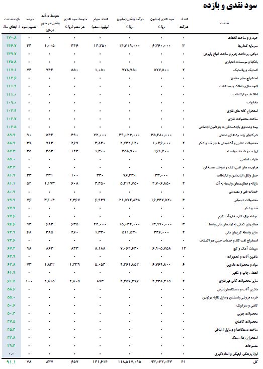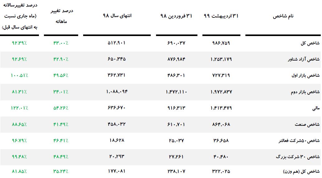 گفتنی است نسبت قیمت به درآمد ۱۲ ماه گذشته، به رقم ۲۰.۰۲ رسید و درصد گردش معاملات از ابتدای سال تا پایان اردیبهشت ماه ۹۹، به رقم ۱۵ رسید که در مقایسه با دوره مشابه سال قبل، ۱۱۷ درصد افزایش داشته است.