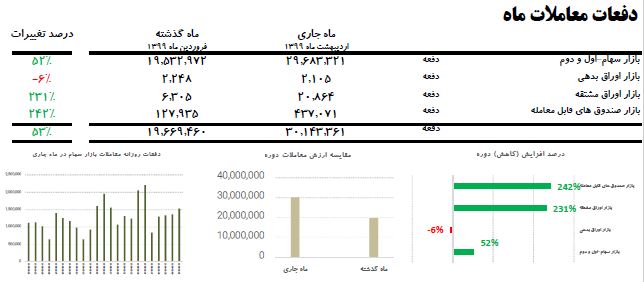 افزون بر این، این آمار نشان می دهد که در اردیبهشت ماه ۹۹، دفعات معاملات سهام برابر با ۵۳ درصد در مقایسه با پایان فروردین ۹۸ افزایش یافت و از ۱۹.۶۶۹.۴۶۰ هزار دفعه به ۳۰.۱۴۳.۳۶۱ هزار دفعه بالغ شد.