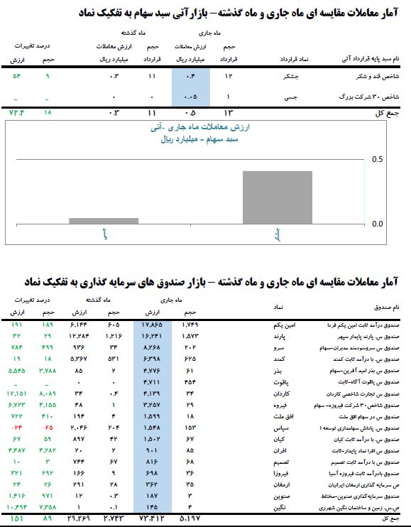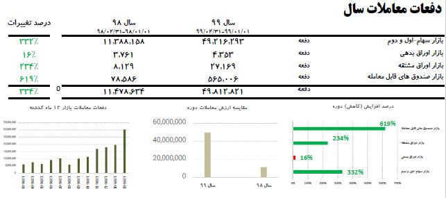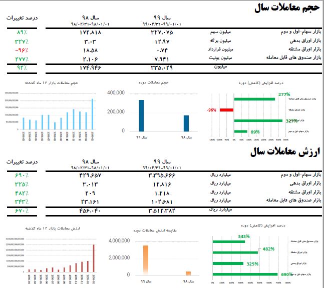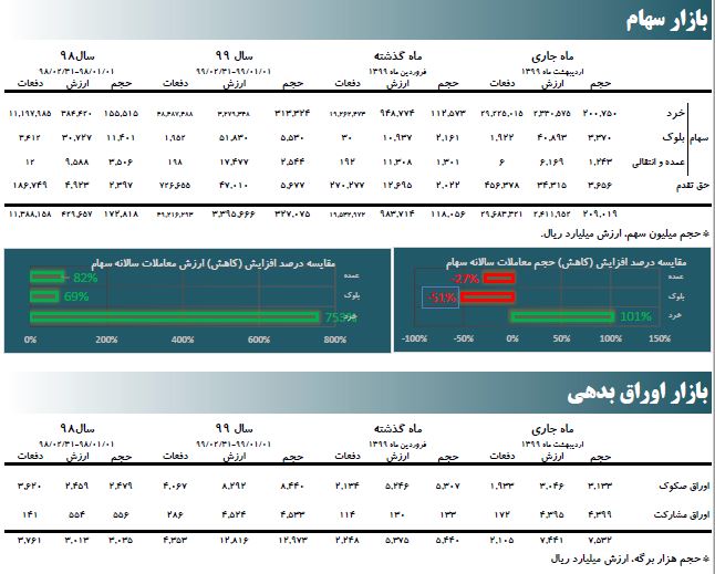 براساس این گزارش، از ابتدای سال ۹۹ تاکنون، متوسط روزانه حجم و ارزش معاملات بازارسهام «اول و دوم» به ترتیب برابر با ۳۲۷۰۷۵ میلیون سهم و ۳۳۹۵۶۶۶ میلیارد ریال بوده است.