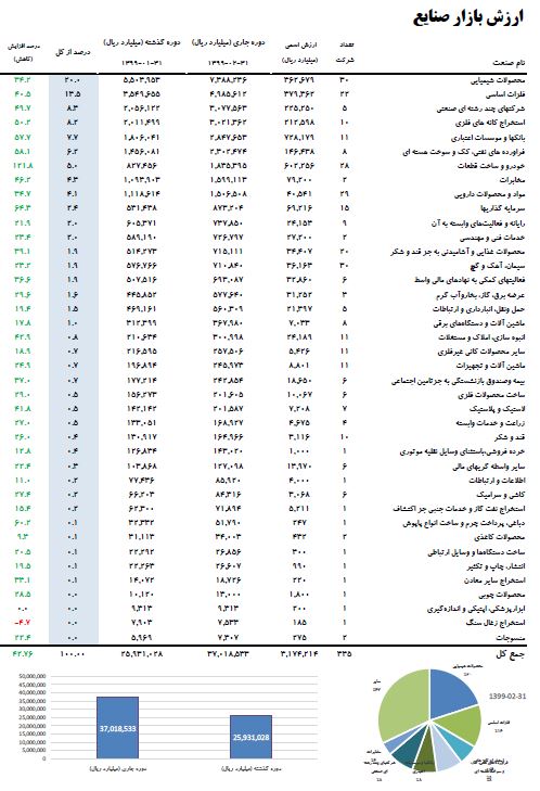 ارزش بازار در پایان اردیبهشت ماه ۹۹ در مقایسه با ماه مشابه سال قبل به میزان ۲۸.۷۷۶.۹۱۵ میلیارد ریال برابر با ۳۴۹ درصد افزایش یافت و از ۸.۲۴۱.۶۱۸ میلیارد ریال به ۳۷.۰۱۸.۵۳۳ میلیارد ریال رسید.