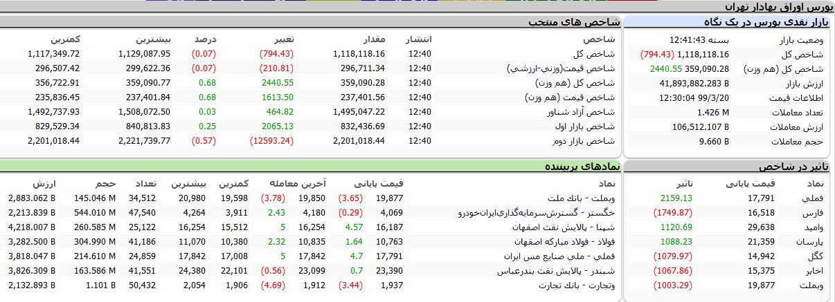 از سویی دیگرجزییات داد و ستدهای روز جاری مشخص می کند که امروز ۷ نماد «فملی با ۲۱۵۹ واحد، فارس با (۱۷۴۹) واحد، وامید با ۱۱۲۰ واحد، پارسان با ۱۰۸۸ واحد، کگل با (۱۰۷۹) واحد، اخابر با (۱۰۶۷) واحد و وبلمت با (۱۰۰۳) واحد»، بیشترین تاثیر را در روند حرکتی شاخص کل بورس بر جای گذاشتند.