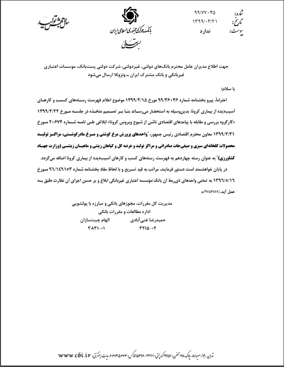 به گزارش خبرنگار ایبِنا، بانک مرکزی در بخشنامهای به تمامی بانکها و موسسات اعتباری اعلام کرد: پیرو بخشنامه شماره ۳۶۰۴۶/۹۹ مورخ ۱۳۹۹.۲.۱۵ موضوع اعلام فهرست رستههای کسب و کارهای آسیبدیده از بیماری کرونا، به استحضار میرساند بنا بر تصمیم متخذه در جلسه مورخ ۱۳۹۹.۲.۲۲ «کارگروه بررسی و مقابله با پیامدهای اقتصادی ناشی از شیوع ویروس کرونا» ابلاغی طی نامه شماره ۲۰۶۷۴ مورخ ۱۳۹۹.۲.۳۱ معاون محترم اقتصادی رئیس جمهور، "واحدهای پرورش مرغ گوشتی و مرغ مادرگوشتی، مراکز تولید محصولات گلخانهای سبزی و صیفیجات صادراتی و مراکز تولید و عرضه گل و گیاهان زینتی و ماهیان زینتی (وزارت جهـاد کشاورزی)" به عنوان رسته چهاردهم به فهرست رستههای کسب و کارهای آسیبدیده از بیماری کرونا اضافه میگردد.