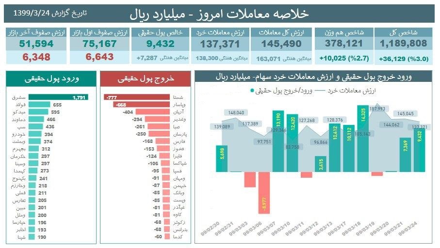 از سویی دیگر امروز ۷ نماد «فولاد با ۳۱۱۸ واحد، فملی با ۲۵۰۶ واحد، فارس با ۲۲۶۳ واحد، وبملت با ۱۳۸۵ واحد، وامید با ۱۲۲۶ واحد، اخابر با ۱۱۷۲ واحد و شپنا با ۱۱۴۸ واحد» بیشترین تاثیر مثبت و منفی را بر شاخص کل بورس بر جای گذاشتند.