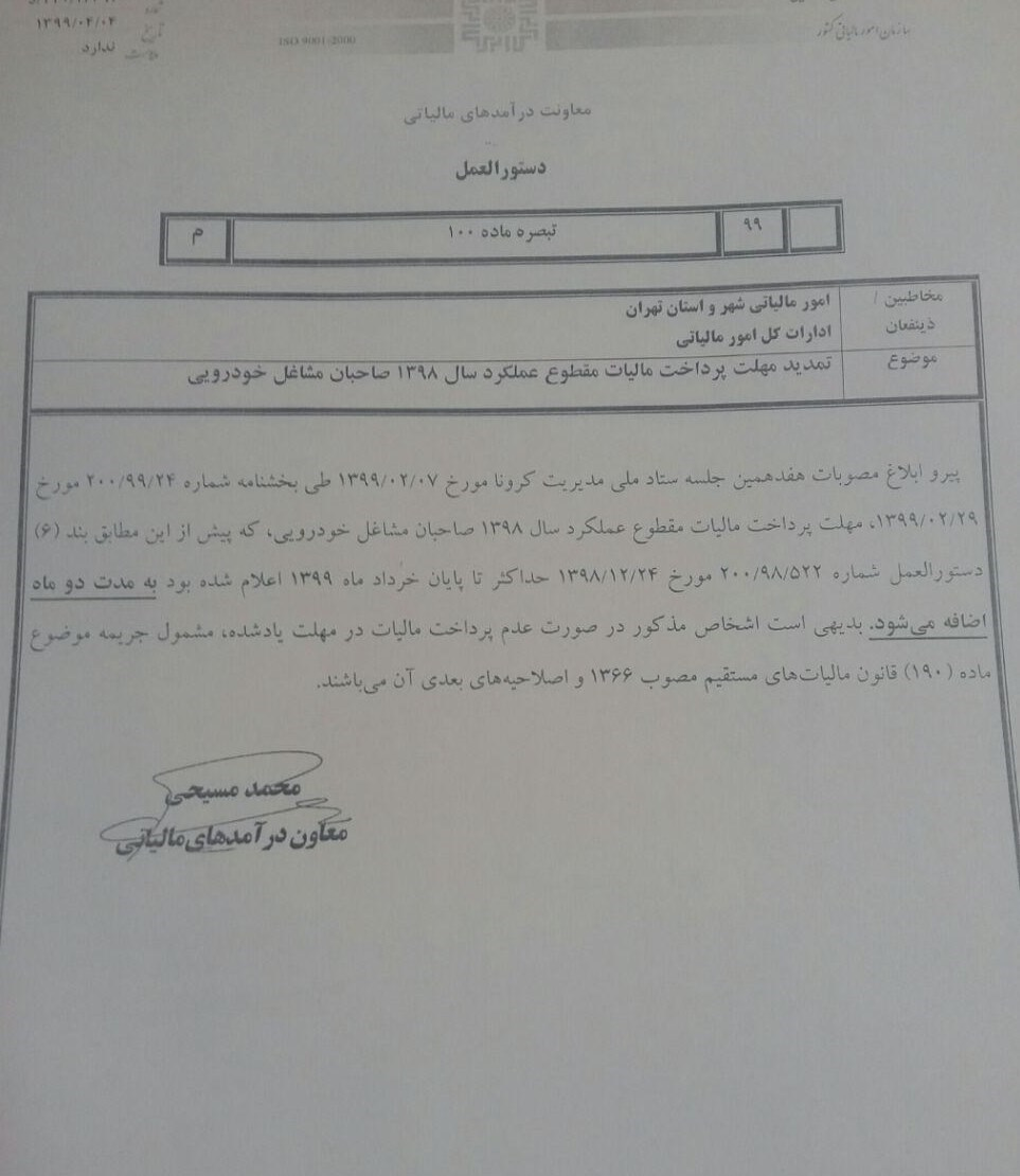 سازمان امور مالیاتی مهلت پرداخت مالیات مقطوع عملکرد سال ۱۳۹۸ مشاغل خودرویی را ۲ ماه تمدید کرد.