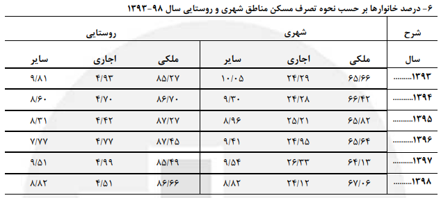همچنین این گزارش بیانگر آن است که در سال گذشته ۶۷ درصد خانوارهای شهری و بیش از ۸۶ درصد خانوارهای روستایی در مسکن‌های ملکی ساکن بوده‌اند. همچنین حدود ۹ درصد خانوارها در مناطق شهری و روستایی در سایر انواع مسکن مانند خانه‌های سازمانی زندگی می‌کنند.