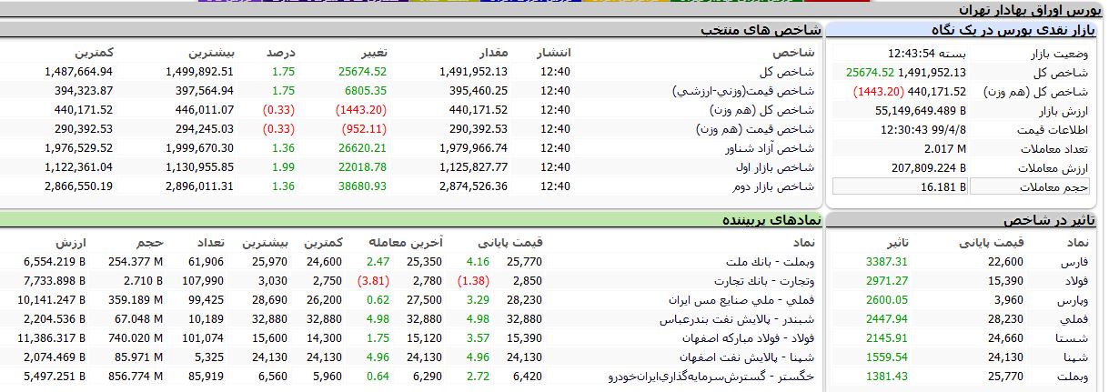 از سویی دیگر امروز ۷ نماد «فارس با ۳۳۸۷ واحد، فولاد با ۲۹۷۱ واحد، فملی با ۲۶۰۰ واحد، شستا با ۲۴۴۷ واحد، کگل با ۲۱۴۵ واحد، شپنا با ۱۵۵۹ واحد و خودرو با ۱۳۸۱ واحد» بیشترین تاثیر مثبت را بر شاخص کل بورس بر جای گذاشتند.