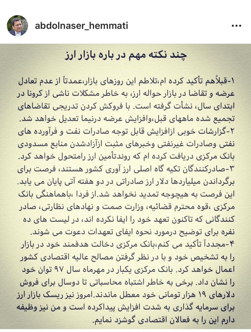 رییس کل بانک مرکزی در یادداشتی اینستاگرامی، چند نکته مهم درباره بازار ارز را مطرح کرد.