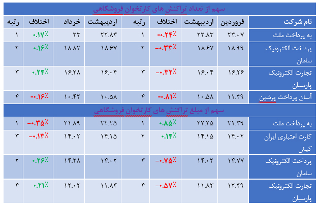 بر اساس این گزارش در مقایسه سهم شرکت های PSP از تعداد تراکنش های کارتخوان فروشگاهی در خردادماه ۹۹ بیانگر این است که شرکت "تجارت الکترونیک پارسیان" در این شاخص با رشد ۰.۲۴ درصدی همراه بوده؛ در حالی که شرکت "کارت اعتباری ایران کیش" با کاهش ۰.۲۴ درصدی به نسبت اردیبهشت ماه ۹۹ بیشترین مقدار کاهش درتعداد تراکنش های این ابزار پذیرش را تجربه کرده است.