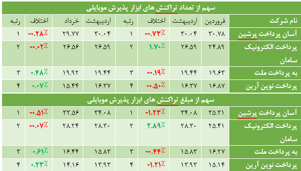 بر اساس این گزارش، "شرکت آسان پرداخت پرشین"که با سهم ۲۹.۷۷ درصدی بیشترین تعداد تراکنشهای ابزار پذیرش موبایلی را در خرداد ماه ۹۹ به خود اختصاص داده بود با بیشترین کاهش به میزان ۰.۲۸درصد به نسبت ماه گذشته مواجه شده و این شرکت همچنین در مبلغ تراکنش های موبایلی نیز به نسبت اردیبهشت ماه ۹۹ کاهش ۰.۵۱ درصدی را تجربه کرده است.