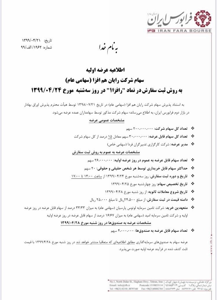 افزون بر این زمان سفارش گیری سهام «رافزا» روز سه شنبه ۲۴ تیر از ساعت ۱۳ تا ۱۷ اعلام شده، مدیر عرضه شرکت کارگزاری تدبیرگران فردا و متعهدین خرید تامین سرمایه لوتوس پارسیان و تامین سرمایه امید هر کدام به میزان ۳۳.۳۳ و ۱۶.۶۷ درصد سهام قابل عرضه در روز عرضه اولیه هستند.