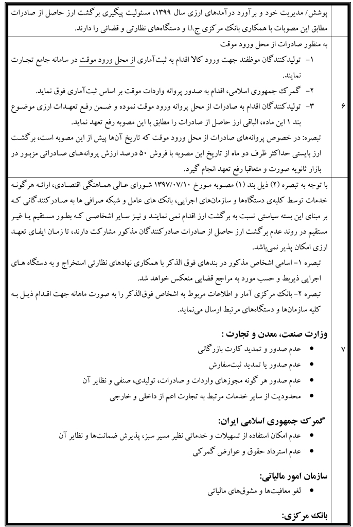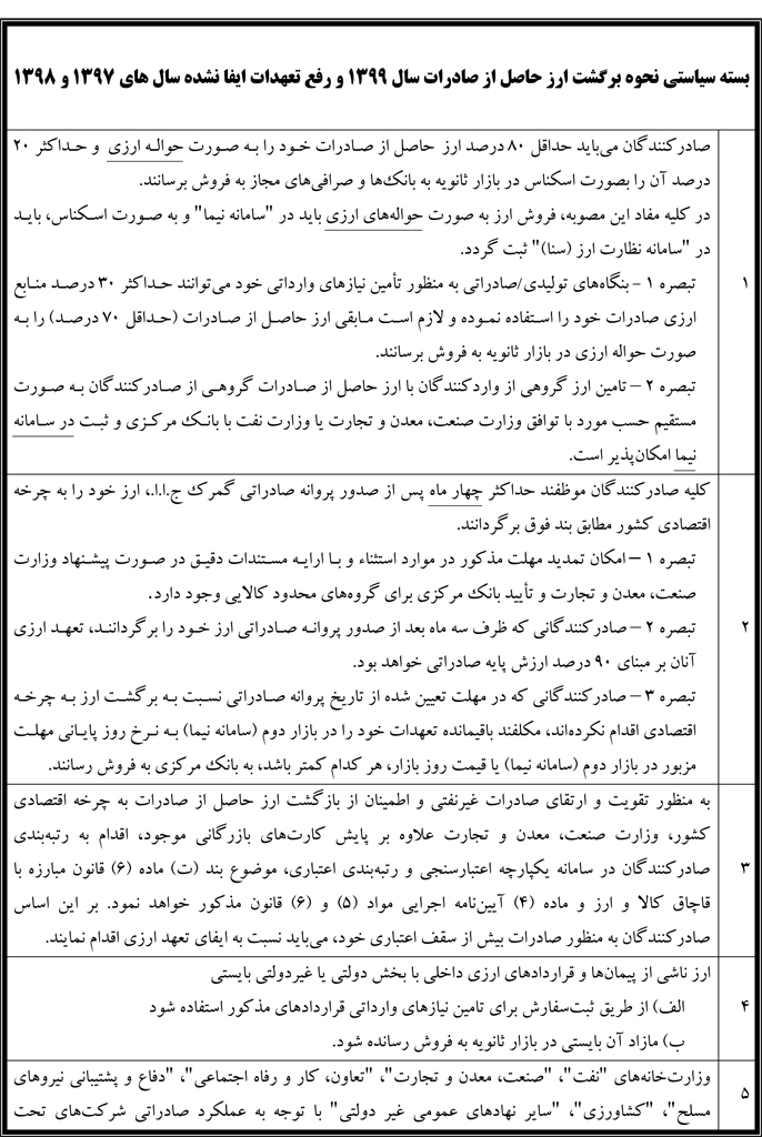 اهم تصمیمات و مصوبات این جلسه با عنوان « بسته سیاستی نحوه برگشت ارز حاصل از صادرات سال ۱۳۹۹ و رفع تعهدات ایفا نشده سال های ۱۳۹۷ و ۱۳۹۸» به شرح زیر است:
