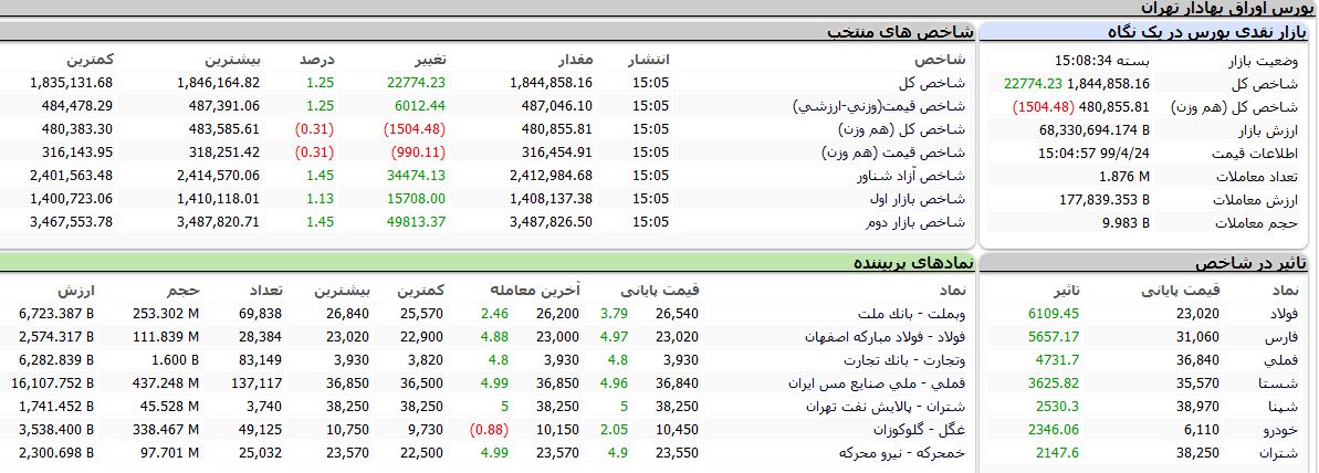 بر اساس آمارهای معاملاتی، روز جاری اکثر شاخصهای بورس با رشد دسته جمعی مواجه شدند به طوری که شاخص کل با ۲۲۷۷۴ واحد صعود معادل ۱.۲۵ درصد به یک میلیون و ۸۴۴ هزار و ۸۵۸ واحد، شاخص قیمت «وزنی - ارزشی» با ۶۰۱۲ واحد افزایش معادل ۱.۲۵ درصد به ۴۸۷ هزار و ۴۶ واحد، شاخص کل «هم وزن» با (۱۵۰۴) واحد افت معادل (۰.۳۱) درصد به ۴۸۰ هزار و ۸۵۵ واحد، شاخص قیمت «هم وزن» با (۹۹۰) واحد افت معادل (۰.۳۱) درصد به به ۳۱۶ هزار و ۴۵۴ واحد، شاخص آزاد شناور با ۳۴۴۷۴ واحد افزایش معادل ۱.۴۵ درصد به ۲ میلیون و ۴۱۲ هزار و ۹۸۴ واحد، شاخص بازار اول با ۱۵۷۰۸ واحد معادل ۱.۱۳ درصد به یک میلیون و ۴۰۸ هزار ۱۳۷ واحد و شاخص بازار دوم با ۴۹۸۱۳ واحد صعود معادل ۱.۴۵ درصد به ۳ میلیون و ۴۸۷ هزار و ۸۲۶ واحد رسید.