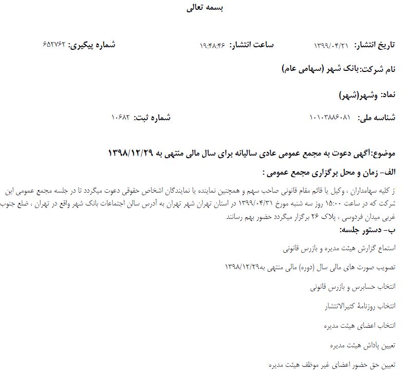 لازم به ذکر است استماع گزارش هیات مدیره و بازرس قانونی، تصویب صورتهای مالی سال (دوره) مالی منتهی به ۲۹ اسفند ماه ۹۸ و انتخاب حسابرس و بازرس قانونی دستور جلسه مجمع عمومی عادی سالیانه شرکت بانک شهر اعلام شده است.