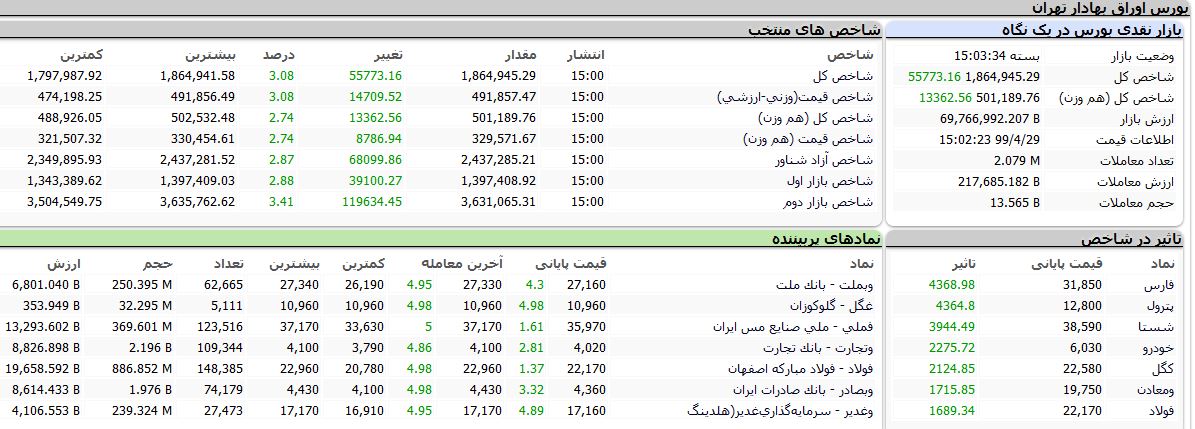 شاخص بورس در پایان داد و ستدهای روز جاری با افزایش بیش از ۵۵۰۰۰ واحدی به یک میلیون و ۸۶۴ هزار و ۷۹۷ واحد رسید تا سهامداران شاهد یک تاریخ سازی جدید در تالار شیشه‌ای باشند.