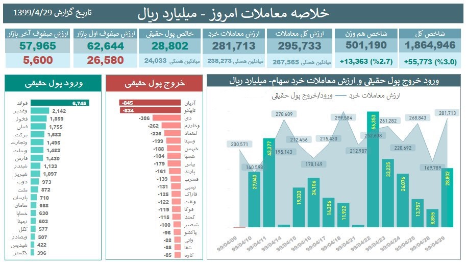 در عین حال نگاهی به آمارهای معاملاتی امروز بازار سهام مشخص می‌کند: قیمت سهام نمادهای «پترول با ۱۰۲.۵۳ درصد، وملی با ۱۳.۰۵ درصد، کهمدا با ۱۱.۲۲ درصد، پکویر با ۱۱.۱۲ درصد، خاهن  با ۹.۵۱ درصد، وساپا با ۸.۹ درصد و تنوین با ۷.۷۴ درصد» بیشترین افزایش قیمت و نمادهای «چفیبر با (۵.۵۶) درصد، فسرب با (۴.۶۸) درصد، زمگسا با (۴.۶۶) درصد، تمحرکه با (۴.۴۶) درصد، قشکر با (۴.۳۵) درصد، ثامان با (۴.۲۷) درصد و کماسه با (۴.۲۳) درصد» بیشترین کاهش قیمت را در بازار سهام رقم زدند و در تابلوهای بورس به ثبت رسیدند.