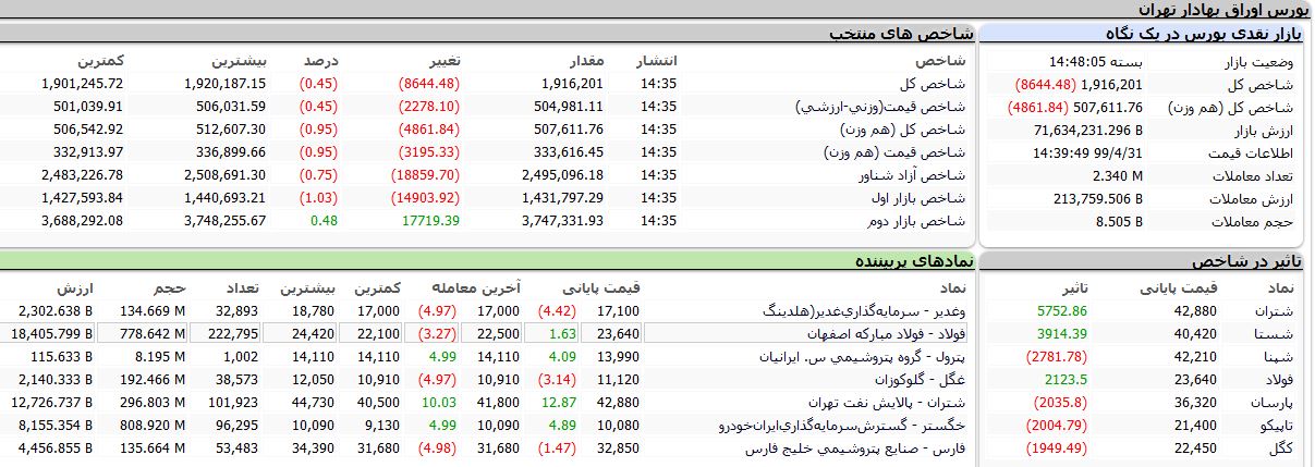 بر اساس آمارهای معاملاتی، روز جاری شاخص های بورس با نوسان مواجه شدند به طوری که شاخص کل با (۸۶۴۰) واحد ریزش معادل (۰.۴۵) درصد به یک میلیون و ۹۱۶ هزار ۲۰۳ واحد، شاخص قیمت «وزنی - ارزشی» با (۲۲۷۷) واحد افت معادل (۰.۴۵) درصد به ۵۰۴ هزار ۹۸۱ واحد، شاخص کل «هم وزن» با (۴۸۶۱) واحد ریزش معادل (۰.۹۵) درصد به ۵۰۷ هزار و ۶۱۲ واحد، شاخص قیمت «هم وزن» با (۳۱۹۵) واحد ریزش معادل (۰.۹۵) درصد به ۳۳۳ هزار و ۶۱۶ واحد، شاخص آزاد شناور با (۱۸۸۵۹) واحد افت معادل (۰.۷۵) درصد به ۲ میلیون و ۴۹۵ هزار و ۹۸ واحد، شاخص بازار اول با (۱۴۹۰۳) واحد افت معادل (۱.۰۳) درصد به یک میلیون و ۴۳۱ هزار ۷۹۷ واحد و شاخص بازار دوم با ۱۷۷۳۴ واحد رشد معادل ۰.۴۸ درصد به ۳ میلیون و ۷۴۷ هزار و ۳۴۵ واحد رسید.