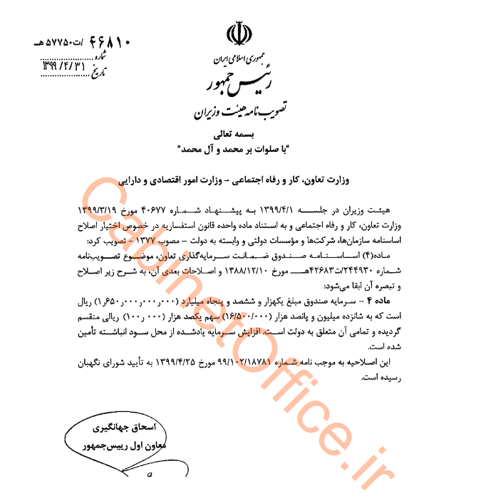 به گزارش ایبِنا به نقل از پایگاه اطلاع رسانی دفتر هیات دولت، هیئت وزیران در جلسه یکم تیر ۱۳۹۹ به پیشنهاد وزارت تعاون، کار و رفاه اجتماعی و به استناد ماده واحده قانون استفساریه در خصوص اختیار اصلاح اساسنامه سازمانها، شرکتها و موسسات دولتی و وابسته به دولت، ماده (۴) اساسنامه صندوق ضمانت سرمایه گذاری تعاون را اصلاح کرد.