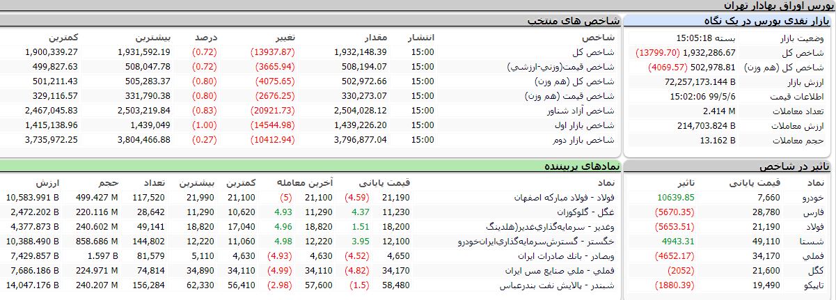بر اساس آمارهای معاملاتی، روز جاری شاخص های بورس با نوسان مواجه شدند به طوری که شاخص کل با (۱۳۷۹۹) واحد ریزش معادل (۰.۷۱) درصد به یک میلیون و ۹۳۲ هزار ۲۸۶ واحد، شاخص قیمت «وزنی - ارزشی»  با (۳۶۲۹) واحد افت معادل (۰.۷۱) درصد به ۵۰۸ هزار ۲۳۰ واحد، شاخص کل «هم وزن» با (۴۰۶۹) واحد ریزش معادل (۰.۸۰) درصد به ۵۰۲ هزار و ۹۷۸ واحد، شاخص قیمت «هم وزن» با (۲۶۷۲) واحد کاهش معادل (۰.۸۰) درصد به ۳۳۰ هزار و ۲۷۷ واحد، شاخص آزاد شناور با (۲۰۷۱۹) واحد افت معادل (۰.۸۲) درصد به ۲ میلیون و ۵۰۴ هزار و ۲۲۹ واحد، شاخص بازار اول با (۱۴۳۷۴) واحد کاهش معادل (۰.۹۹) درصد به یک میلیون و ۴۳۹ هزار ۳۹۵ واحد و شاخص بازار دوم با (۱۰۴۱۲) واحد افت معادل (۰.۲۷) درصد به ۳ میلیون و ۷۶۹ هزار و ۸۷۷ واحد رسید.