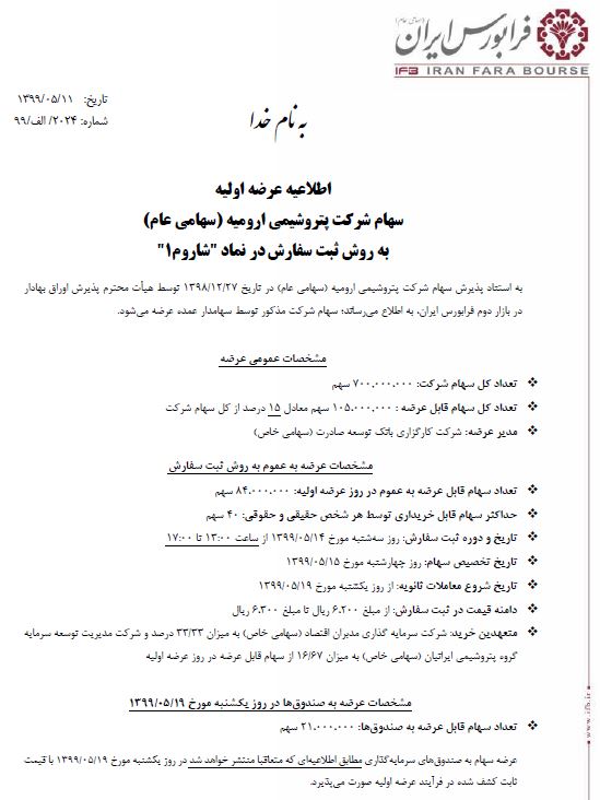 اطلاعیه عرضه اولیه ۱۲ درصدی سهام پتروشیمی ارومیه