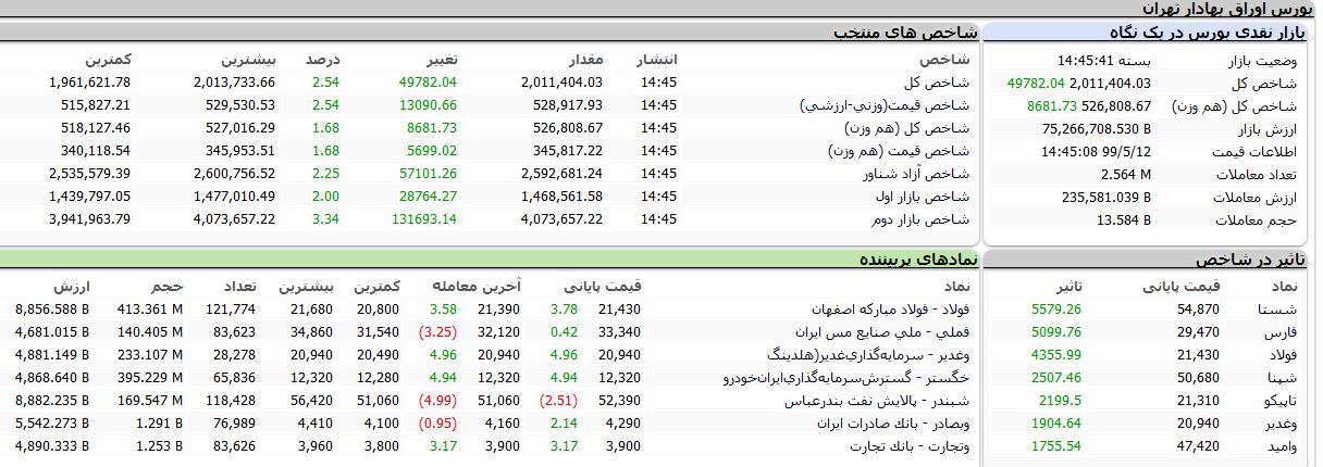 بر اساس آمارهای معاملاتی، روز جاری همه شاخصهای بورس با رشد دسته جمعی مواجه شدند به طوری که شاخص کل با ۴۹۷۸۲ واحد صعود معادل ۲.۵۴ درصد به ۲ میلیون و ۱۱ هزار و ۴۰۴ واحد، شاخص قیمت «وزنی - ارزشی» با ۱۳۰۹۰ واحد افزایش معادل ۲.۵۴ درصد به ۵۲۸ هزار و ۹۱۷ واحد، شاخص کل «هم وزن» با ۸۶۸۱ واحد افزایش معادل ۱.۶۸ درصد به ۵۲۶ هزار و ۸۰۸ واحد، شاخص قیمت «هم وزن» با ۵۶۹۹ واحد افزایش معادل ۱.۶۸ درصد به ۳۴۵ هزار و ۸۱۷ واحد، شاخص آزاد شناور با ۵۷۱۰۱ واحد افزایش معادل ۲.۲۵ درصد به ۲ میلیون و ۵۹۲ هزار و ۶۸۱ واحد، شاخص بازار اول با ۲۸۷۶۴ واحد معادل ۲ درصد به یک میلیون و ۴۶۸ هزار ۵۶۱ واحد و شاخص بازار دوم با ۱۳۱۶۹۳ واحد صعود معادل ۳.۳۴ درصد به ۴ میلیون و ۷۳ هزار و ۶۵۷ واحد رسید.