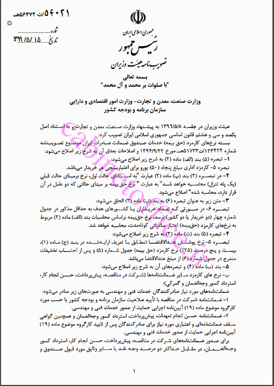 به گزارش ایبِنا، هیات وزیران در جلسه ۸ مرداد ۱۳۹۹ به پیشنهاد وزارت صنعت، معدن و تجارت، بسته نرخ های کارمزد (حق بیمه) خدمات صندوق ضمانت صادرات ایران را اصلاح کرد.