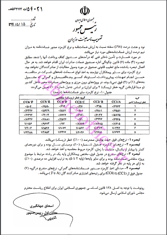 نرخ کارمزد برای سایر پیمانکاران نیازمند به اخذ انواع ضمانت نامههای شرکت در مناقصه، حسن انجام تعهدات، پیشپرداخت، استرداد کسور وجه الضمان، و گمرکی که مشمول بندهای فوق نمیگردند، در پروژههای برون مرزی و پروژههای صادرات محور داخل کشور (و مبنا قراردادن گروه ریسک ۲ برای ایران) تعیین می گردد.