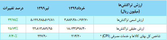 همچنین براساس این آمار ارزش اسمی تراکنشها در تیرماه ۹۹ نسبت به ماه مشابه سال گذشته ۹۶.۴۹ درصد رشد داشته است که میتوان آن را شاهدی برای افزایش استقبال عمومی از پرداخت الکترونیکی تفسیر کرد. این آمار همچنین نشان میدهد که رشد حقیقی ارزش تراکنشها بدون در نظر گرفتن اثرات تورم محاسبه شده است ۵۴.۹۳ درصد است.
