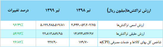 ارزش اسمی تراکنشهای تیر ۹۹ نسبت به ماه گذشته با رشد ۳۳.۷۸ درصدی همراه بوده و این در حالی است که ارزش حقیقی تراکنشها در تیر ۹۹ رشد ۲۵.۷۴ درصدی را تجربه کرده است. ارزش حقیقی تراکنشها در واقع ارزش تراکنشهای شاپرکی بدون در نظر گرفتن اثرات تورم است. به عبارت دیگر ارزش تراکنشهای شاپرکی که نسبت به نرخ تورم خالصسازی شده است، ارزش حقیقی تراکنشهای شاپرکی را تشکیل میدهد.