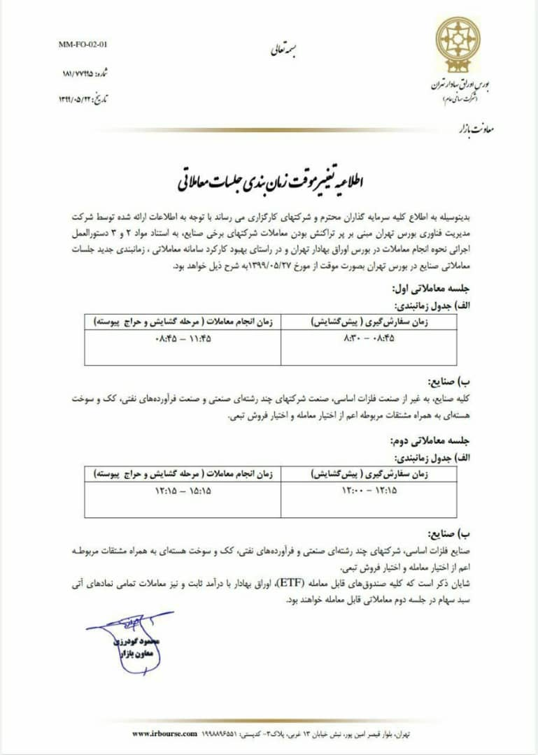 به گزارش ایبِنا، معاون بازار بورس اوراق بهادار تهران طی اطلاعیهای اعلام کرد که با توجه به اطلاعات ارائه شده توسط شرکت مدیریت فناوری بورس تهران مبنی بر پرتراکنش بودن معاملات شرکتهای برخی صنایع، زمانبندی جدید برای معاملات بورس تهران به صورت موقت از روز ۲۷ مرداد ماه اعمال خواهد شد.