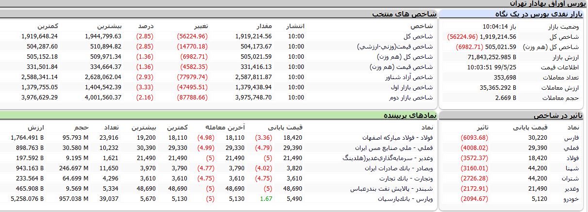 به گزارش خبرنگار ایبِنا، در معاملات روز جاری تالار شیشه ای «تا لحظه تنظیم خبر» شاخص بورس با ۵۶۲۲۴ واحد سقوط در کانال یک میلیون و ۹۰۰ هزار واحدی قرار گرفت و به یک میلیون و ۹۱۹ هزار و ۲۱۴ واحد رسید.